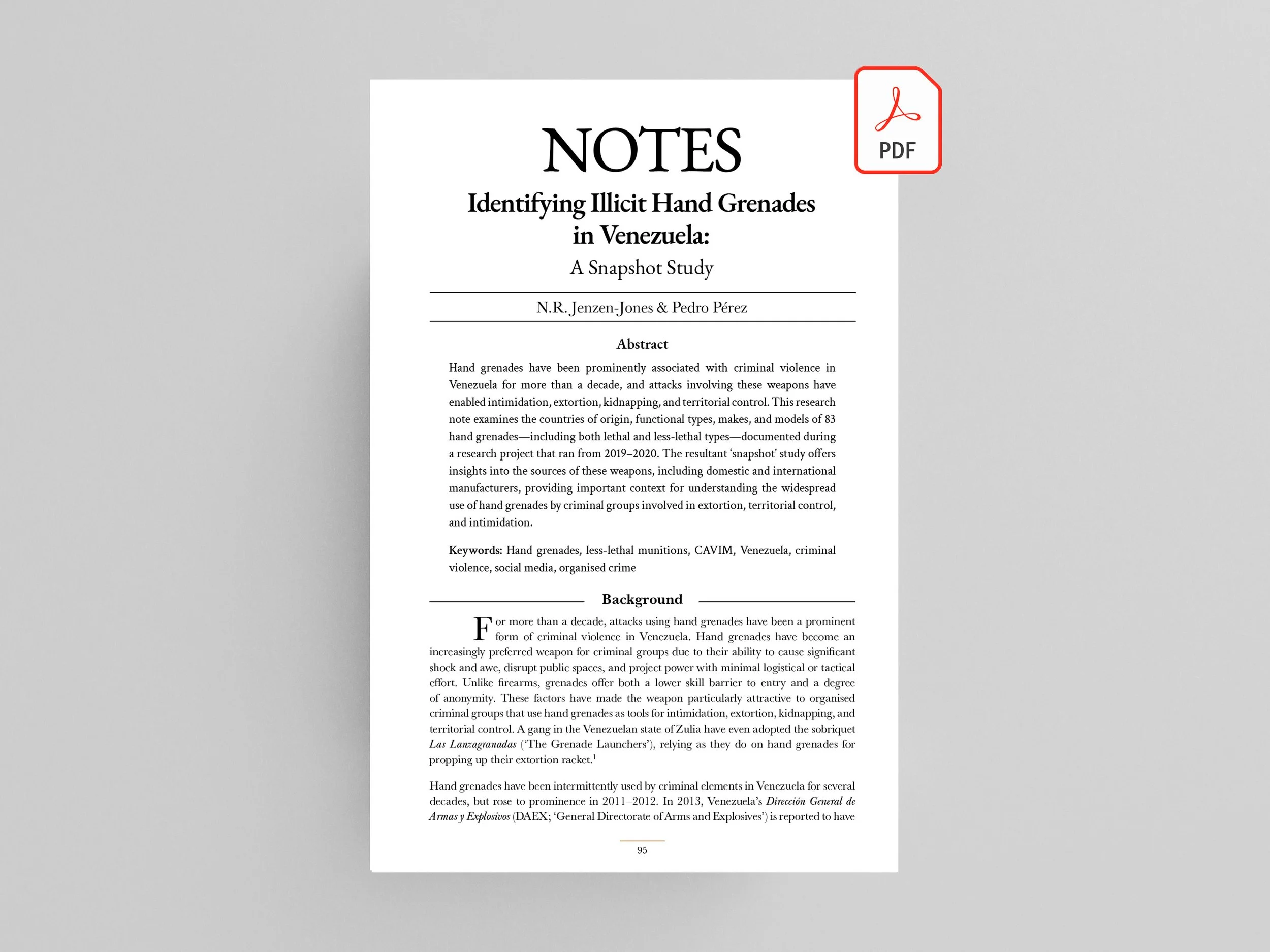 Hand grenades have been prominently associated with criminal violence in Venezuela for more than a decade, and attacks involving these weapons have enabled intimidation, extortion, kidnapping, and territorial control. This research note examines the countries of origin, functional types, makes, and models of 83 hand grenades—including both lethal and less-lethal types—documented during a research project that ran from 2019–2020. The resultant ‘snapshot’ study offers insights into the sources of these weapons, including domestic and international manufacturers, providing important context for understanding the widespread use of hand grenades by criminal groups involved in extortion, territorial control, and intimidation.